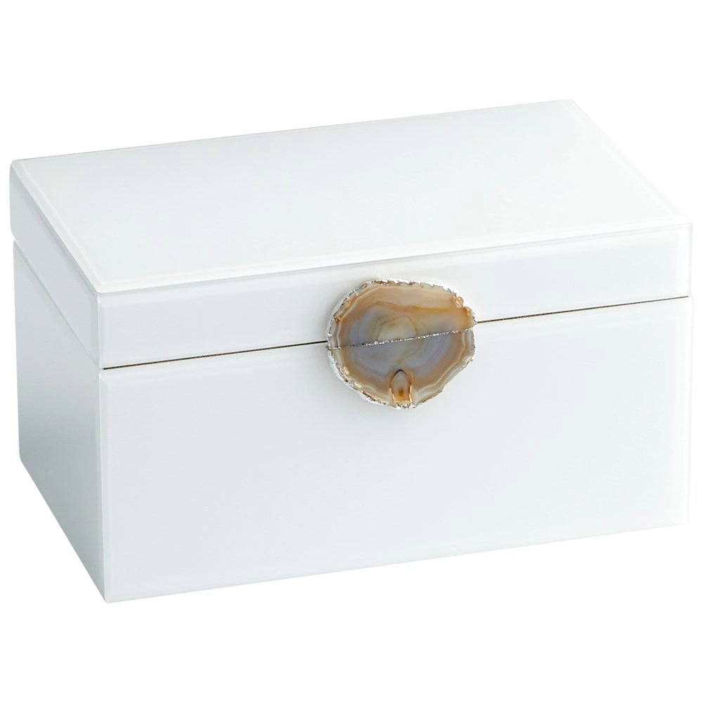 Modern-organic loveliness graces this classic glass container. A sleek, glossy white finish adorns the exterior of this accent box, topped with a decorative gem stone accent serving as its handle. Store your jewelry, small electronics, trinkets, or any other personal items.