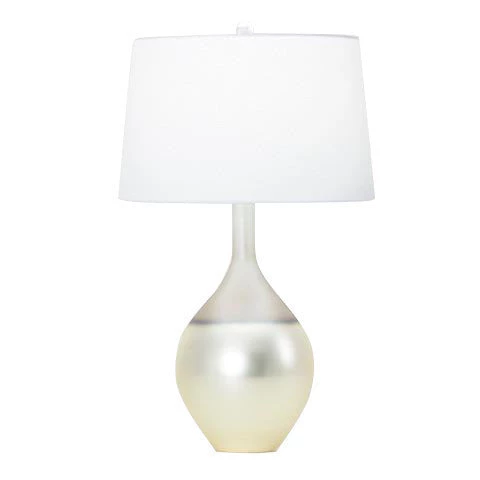 This elegant lamp is mouth-blown glass with a pearlescent graduated finish metal with hints of silver. The shade is an off-white cotton.
