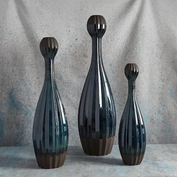 Fluted ribs on these Portuguese ceramic vessels show off the deep blue reactive glaze brilliantly.