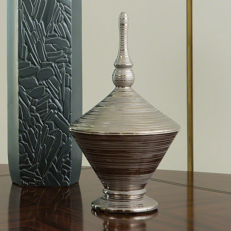 This whimsical lidded ceramic jar in silver metallic glaze adds function and sparkle to any room.
