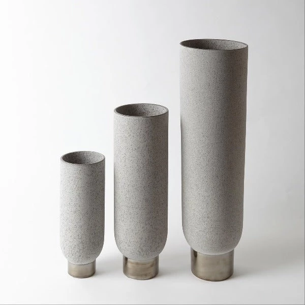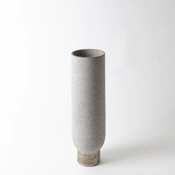 This silver banded vase is molded of ceramic with a volcanic texture offset by an electroplated silver base.