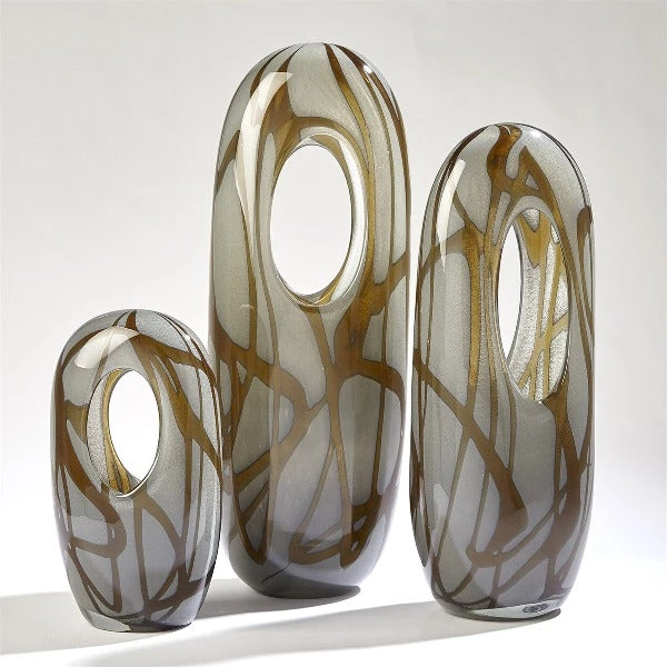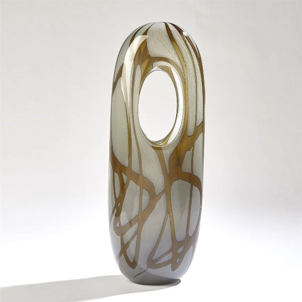 Beautiful art glass vase with a unique hole cut straight through the middle. Amber and grey colored glass tubes are formed together in molten state to achieve the design.