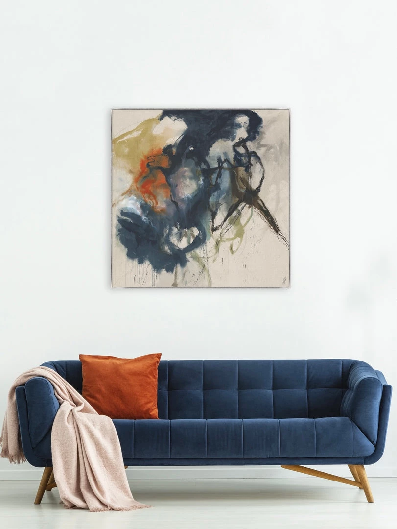 This unique abstract art is imprinted on a beautiful linen canvas, with gorgeous blue, orange and gold. Available in multiple sizes.