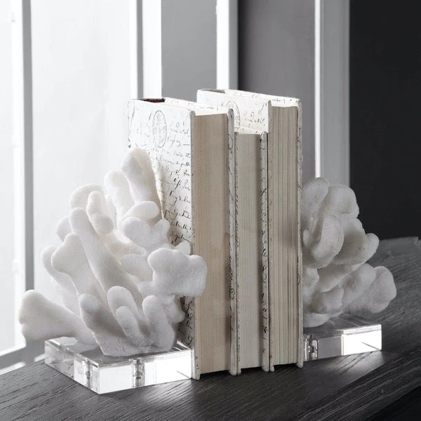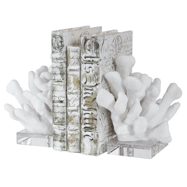 Set of two bookends, featuring textured faux white coral on crystal bases.